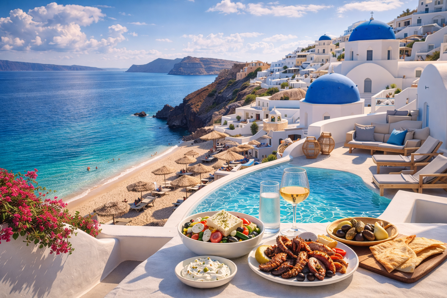 - Perissa Beach – černý písek a klidnější atmosféra.